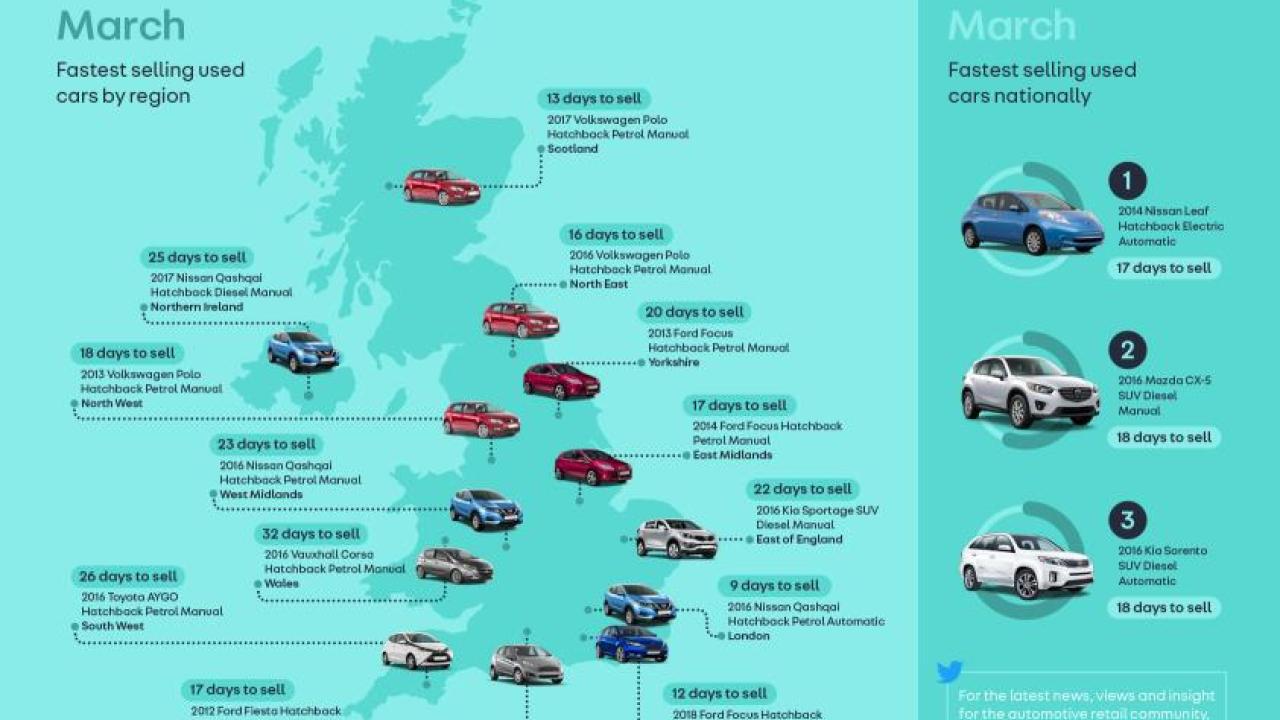 Petrol vehicles continued to dominated, with 77% of the top regional spots taken by petrol powertrains including in the East Midlands (2014 Ford Focus – petrol manual – 17 days), London (2016 Nissan Qashqai – petrol automatic – 9 days), North East (2016 Volkswagen Polo – petrol manual – 16 days), North West (2013 Volkswagen Polo – petrol manual – 18 days), Scotland (2017 Volkswagen Polo – petrol manual – 13 days), South (2012 Ford Fiesta – petrol manual – 17 days), South West (2016 Toyota AYGO – petrol manual – 26 days), Wales (2016 Vauxhall Corsa – petrol manual – 32 days), West Midlands (2016 Nissan Qashqai – petrol manual – 23 days) and Yorkshire (2013 Ford Focus – petrol manual – 20 days).