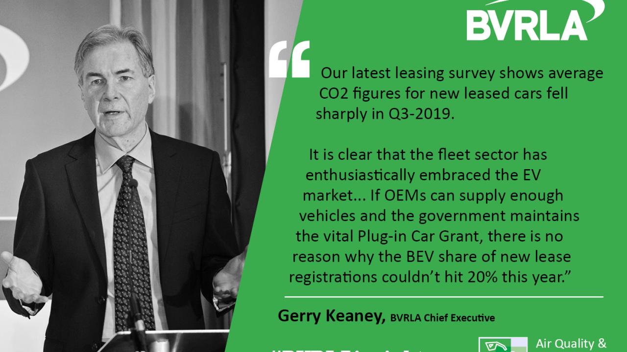 Average CO2 figures for new leased cars showed a fall in the third quarter of Q3 2019, thanks to a surge in battery electric vehicle (BEV) registrations, the BVRLA’s Q3 2019 Quarterly Leasing Survey has found.